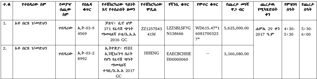 ማሳሰቢያ:- ተሸከርካሪዎቹ ተለያይተው አይሸጡም፣ የጨረታ ማስከበሪያ ሲ.ፒ.ኦ. ለየብቻ መሰራት አለበት።