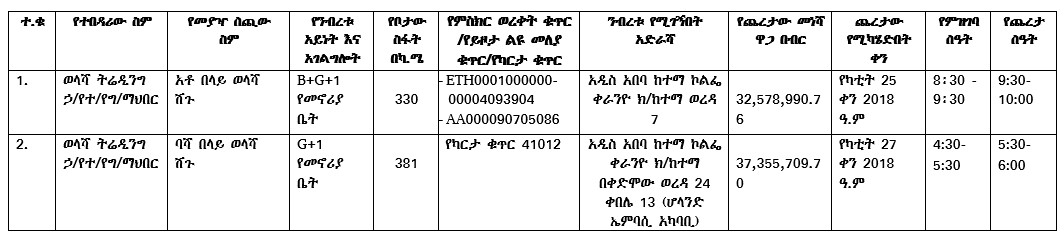 - ንብረቶቹን በሥራ ሰዓት አስቀድሞ ፕሮግራም አስይዞ መጎብኘት ይቻላል።