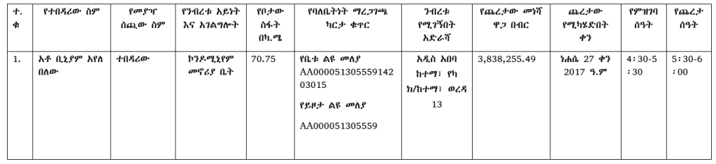 - ንብረቱን በሥራ ሰዓት ፕሮግራም አስይዞ መጎብኘት ወይም ማየት ይቻላል።
