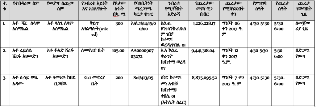 - ንብረቶቹን በሥራ ሰዓት ፕሮግራም አስይዞ መጎብኘት ወይም ማየት ይቻላል።