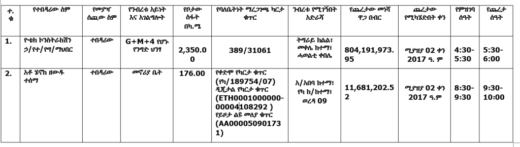 - ንብረቱን በሥራ ሰዓት ፕሮግራም አስይዞ መጎብኘት ወይም ማየት ይቻላል።