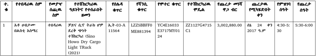 አቢሲንያ ባንክ /አ.ማ/ ለሰጠው ብድር በዋስትና የያዘዉንና በሠንጠረዡ የተመለከተውን ተሽከርካሪ በአዋጅ ቁጥር 1147/2011 መሠረት ንብረቱን ባለበት ሁኔታና አሁን በሚገኝበት ይዞታ ላይ እንዳለ በግልጽ ጨረታ አወዳድሮ ለመሸጥ ይፈልጋል፡፡ በመሆኑም ተጫራቾች ለጨረታ ከመቅረባቸው በፊት የሚከተሉትን ደንቦች መገንዘብ ይኖርባቸዋል፡፡
