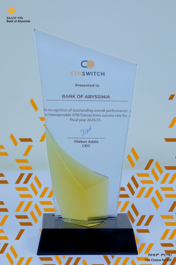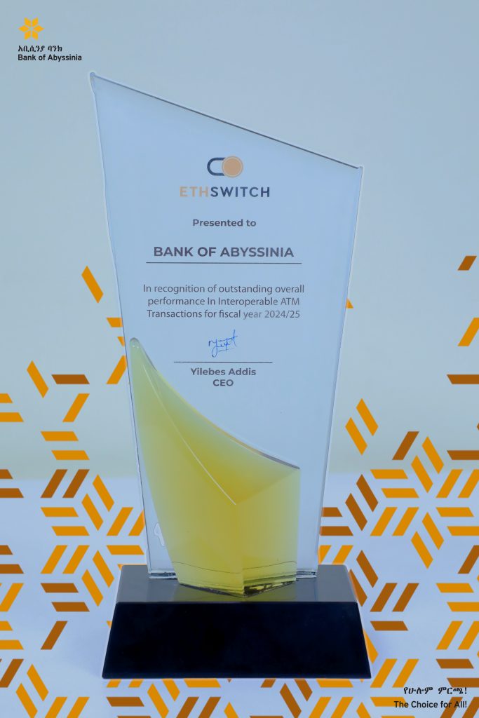 ኢትስዊች አክሲዮን ማህበር ጥቅምት 18 ቀን 2018 ዓ.ም በሸራተን አዲስ ባካሄደው 12ኛው ዓመታዊ የባለአክሲዮኖች ስብሰባ ማጠናቀቂያ ላይ ባንካችን አቢሲንያ እ.ኤ.አ በ2024/25 በጀት ዓመት በባንክ ለባንክ ግብይት ላስመዘገበው የላቀ አፈጻጸም የዕውቅና ሽልማት አበርክቶለታል።