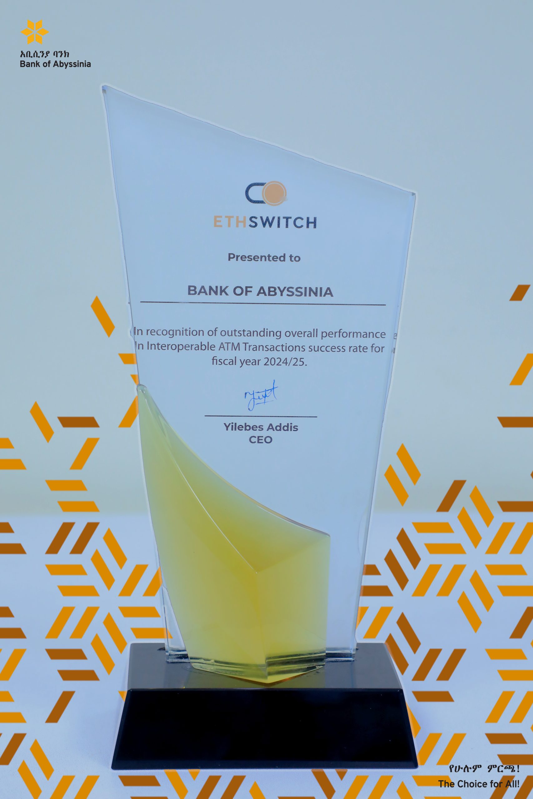 ኢትስዊች አክሲዮን ማህበር ጥቅምት 18 ቀን 2018 ዓ.ም በሸራተን አዲስ ባካሄደው 12ኛው ዓመታዊ የባለአክሲዮኖች ስብሰባ ማጠናቀቂያ ላይ ባንካችን አቢሲንያ እ.ኤ.አ በ2024/25 በጀት ዓመት በባንክ ለባንክ ግብይት ላስመዘገበው የላቀ አፈጻጸም የዕውቅና ሽልማት አበርክቶለታል።